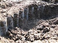 いままでの失敗事例として、長さ7mの畝に対して、直角に1mごとに幅30センチの波板を埋め込みました。この程度の深さでは、何枚もの波板を潜り抜け全く役に立たなかったのです。 また、侵入してくる本道に対して、大がかりに”コ”の字に囲っても、波板に添って掘り進み、波板が無くなったところから侵入してきました。これらの失敗を重ねていき、最終的に、囲いました。
