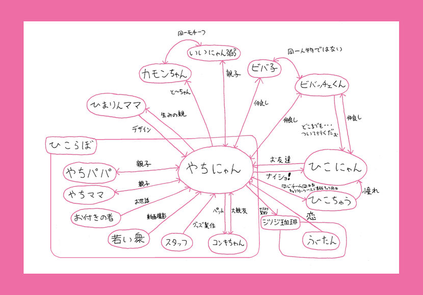 弥千代姫の純愛がやちにゃんの着物や肉球のハートマークに、嫁入り道具と一緒に持って行った雛道具がやちにゃんの好きな事「雛人形で遊ぶこと」に繋がっています。