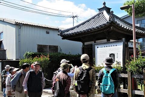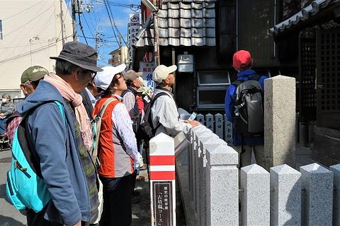 芥川商店街を抜け、「芥川仇討ちの辻」を過ぎ、すぐ近くの芥川一里塚で説明を聞くメンバー