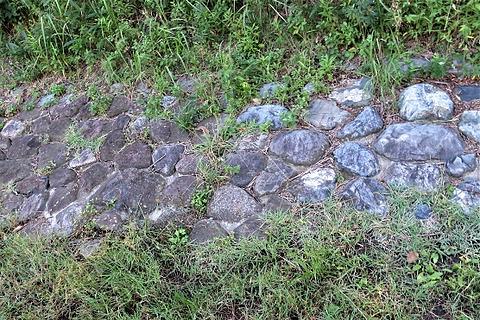 古墳の葺石の説明を受け、オリジナルの葺石がある場所へ。 色が濃い石がオリジナルの葺石で、薄い方が修理のため積んだ葺石