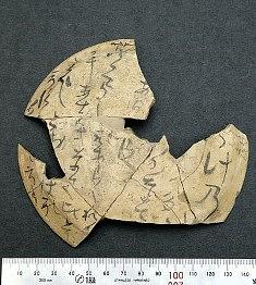 11月28日(木)京都市中京区の平安京跡にある有力貴族邸跡で平仮名の墨書が見つかったと京都市埋蔵文化財研究所が発表された。平仮名は「古今和歌集」や「土佐日記」が編集された10世紀前半に確立したと考えられてきたが、通説より半世紀程度早く完成したことを示す一級の発見であった。