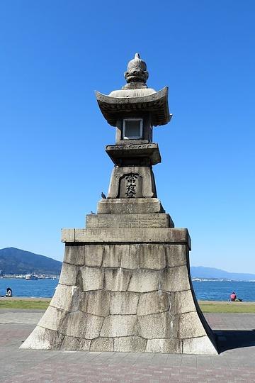 湖岸道路を渡り、石場の灯篭。ここで集合写真撮影予定。