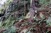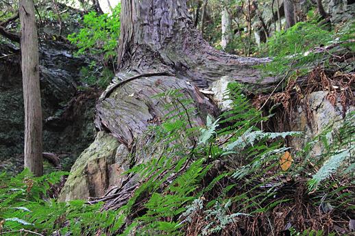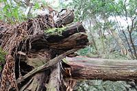 光を求めて天を突こうとする巨幹をささえるために、樹根は力の限り四方へ広げているのであろうが、この急峻な地形では、少しの根の力のバランスを欠くと、倒木となっていた。
