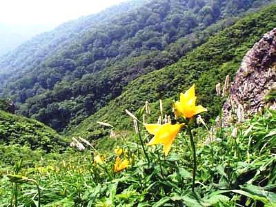 幽玄の滝からブナ林の中を進むと、右手に雄大なスケールを持った夜叉の大岩壁が姿を現してきた。標高が1300m未満の山であるが荒々しい岩壁に迫力を感じた。一旦池ノ又谷の沢を左へ大きく回り込んで急登に取り付いた。右手に昇龍の滝が急斜面を流れ落ちる辺りにニッコウキスゲが群生していた。池ノ又谷の最後のガレた斜面を登りきり県境の稜線に出た。南側の岩壁下に急峻な草地にもニッコウキスゲの群生が見られた。