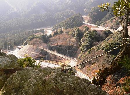 ここを登りきり、鬱蒼とした檜の林を進むと鏡岩の標識がある。「鈴鹿山の鏡岩鏡岩」に寄って見ることにした。別名「鬼の姿見」といい、峠に住む盗賊が、街道を通る旅人の姿をこの鏡の肌面に写して待ち伏せしたといわれるという伝説がある。岩上の見晴台からは、今は、上下線に分離されている国道1号が、手に取るように見えた。高畑山←クリック