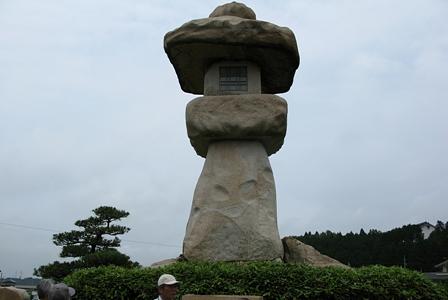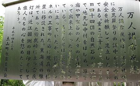 両脇の茶畑を通り過ぎると、今から約270年前、四国の金比羅参りに行く人の道中安全を願い、「万人講常夜燈」が建てられてあった。高さ5.44m、重さ38トンもある巨大な自然石である。