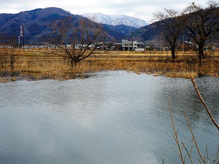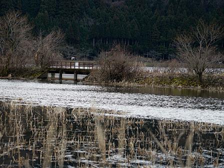〝余呉湖〟の湖岸にある『余呉湖観光館』前にある駐車場に停め、〝内湖らしき〟ところを目指した。桜咲くころ、大型の観光バスが数台並びに花見客でにぎやかになるところだ。導水路にかかる橋を渡って、湖畔沿いのあぜ道を西方向に黙々と進むと、余呉湖と隔離されている内湖のような箇所に導かれた。そこには、埋没林に関する立札があった。