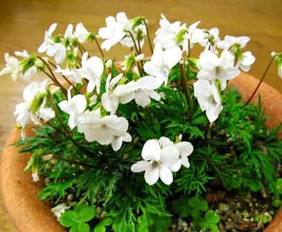 この言葉を頼りに、図書館で調べました。山野草の図鑑を眺めている内に、葉がエイザンスミレよりもさらに極端に細裂する点と花色が白い点が気になり始めました。