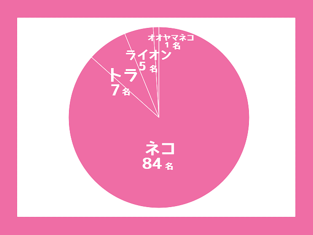 圧倒的な猫率です。次いで虎、ライオン、オオヤマネコとなりました。なお、今回は猫耳が体の一部になっている人っぽいキャラクターも猫としてカウントしています(猫84名のうち4名が該当)。