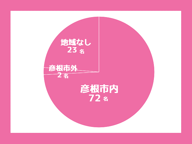 彦根市内のキャラクターが72名、彦根市に関連する彦根市外のキャラクターが2名(甲良町のとらにゃん、日野町のがもにゃん)、特に地域を明示していない彦根に関連するキャラクターが23名でした。