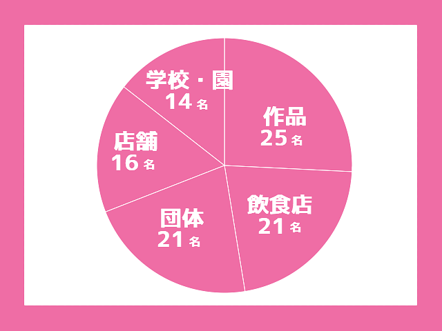 ゲームなどの作品の登場人物が25名、飲食店のキャラクターが21名、市・協会・NPOなどの団体のキャラクターが21名、飲食店以外の店舗が16名、学校や園に関連するキャラクターが14名となりました。公共の施設は学校関係が多く、店舗は飲食店が多いです。それ以外は特に目立った偏りはなく、様々な場面で猫科のキャラクターが活躍しています。