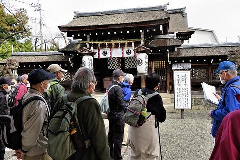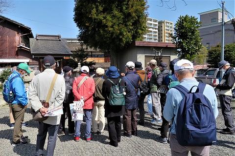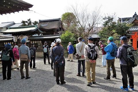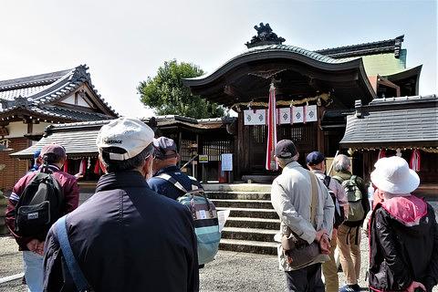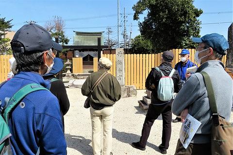粟津神社の境内で説明を聞くメンバー。 粟津神社はもともと膳所五社の総社とのことで、いまでも丁寧にお守りされていました。