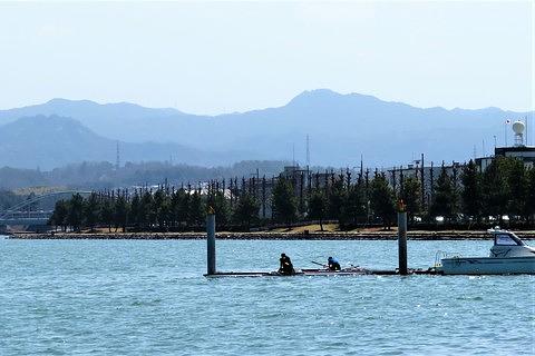 旧御殿浜海水浴場で小休止。 近江八景の『粟津の青嵐』遠景。