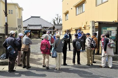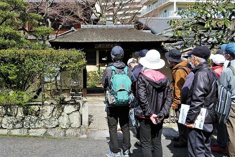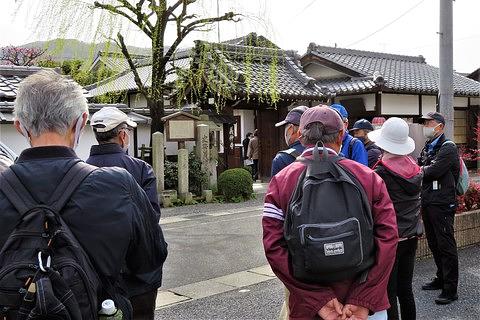 義仲寺へ。 義仲寺前で説明を聞くメンバー。
