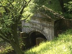 峠を越えて、右、西大津バイパス 左、疏水の案内を見て狭い下り道を一気に降りると、左に第一竪坑が現れる。第1トンネル(長等山のトンネル)は,当時我が国最長のもので多くの人達がその成功を疑いましたが,山の両側から掘っていくほかに,山の上から垂直に穴を掘りそこから山の両側に向けて工事を進めていく竪坑(シャフト)方式を我が国で初めて採用し,工事の促進を図ったそうです。