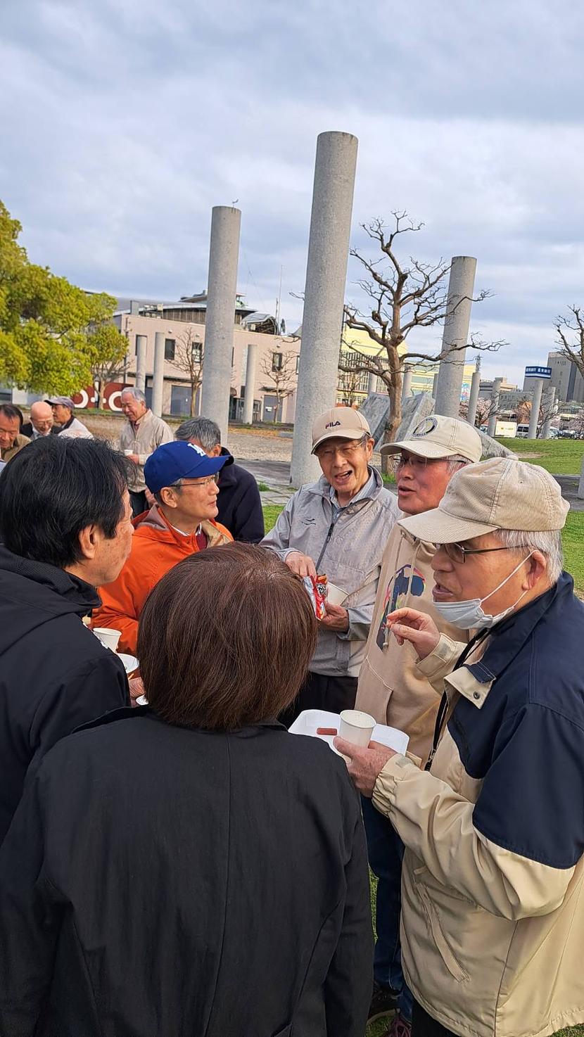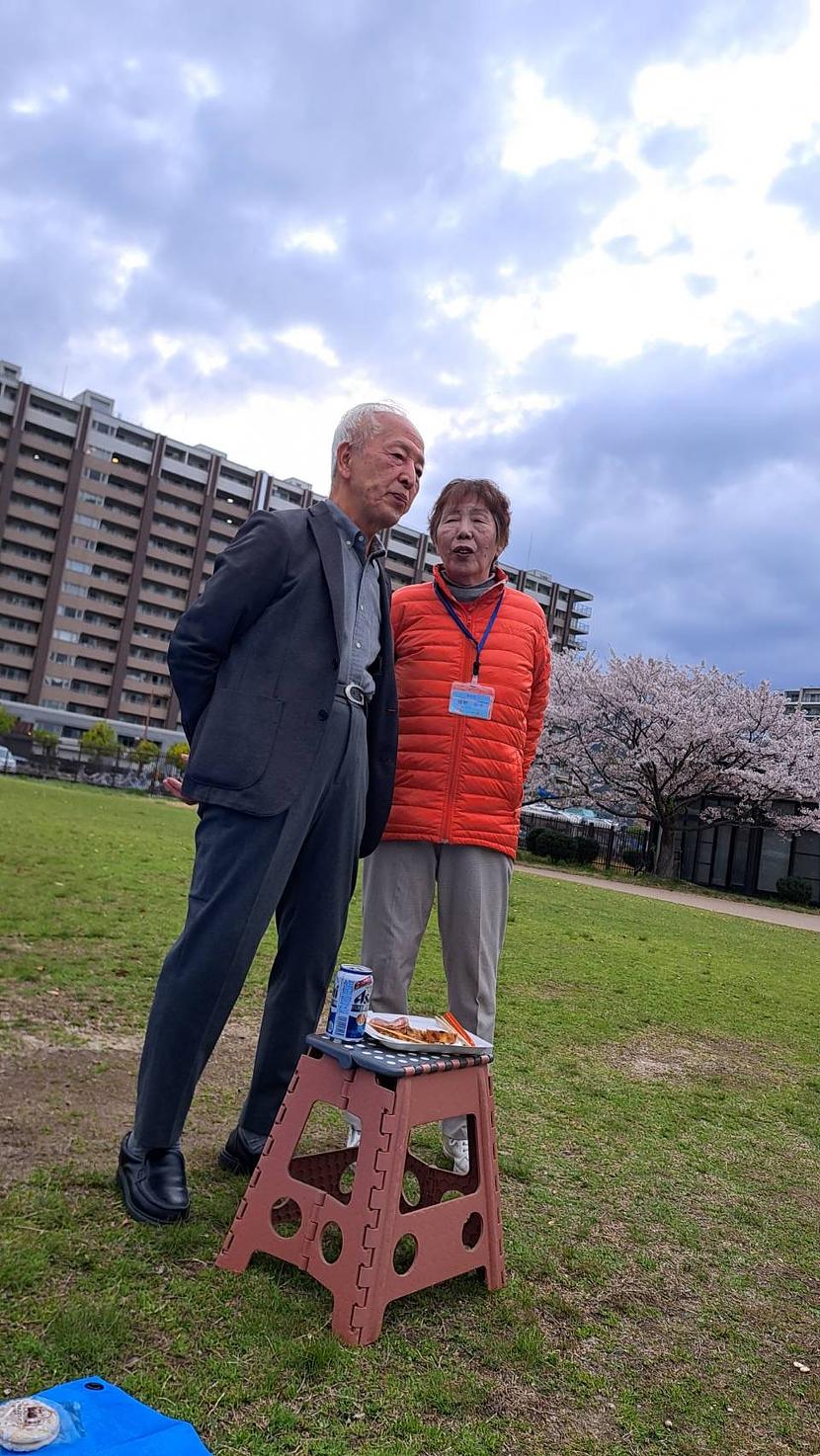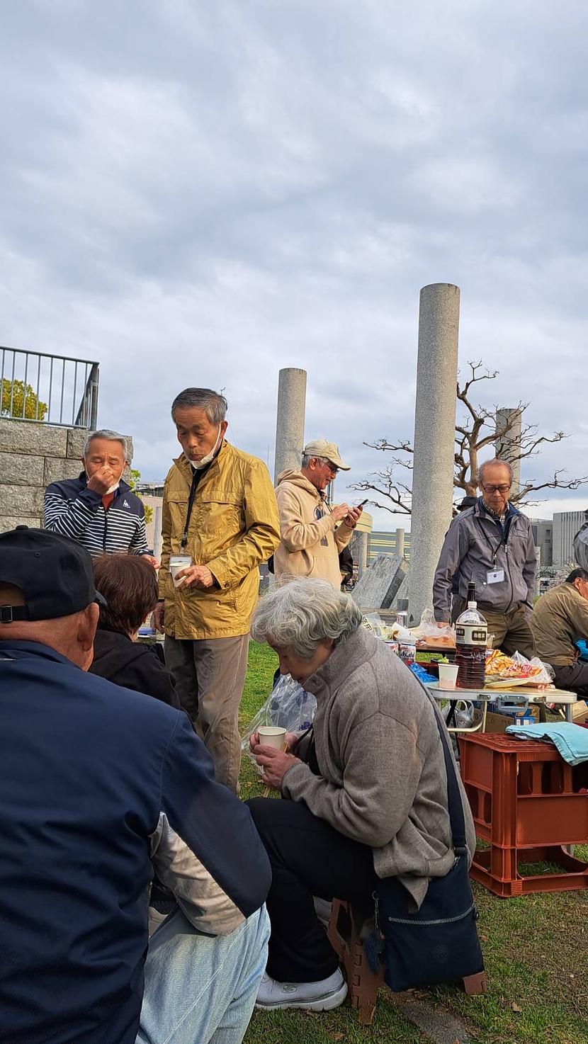 サロン終了後、恒例の浜大津・大津港シンボル緑地で春のワンコインパーティを開催。特別会員で松井前会長も参加され、楽しいひと時を過ごしました。女性陣が持ち寄った手作り料理を味わい、アルコールも進んであちこちで親睦の輪が。1時間半余りの春の宴は最後に満開の桜を背景に記念写真に納まりました(写真)