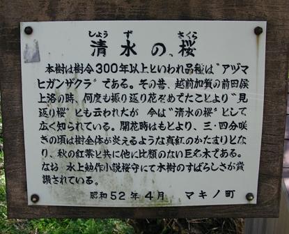 「清水の桜」は、アズマヒガンザクラと呼ばれる種類の桜で、滋賀県自然記念物にも指定されている。桜の野生種の一つ。彼岸ごろに花を咲かせることからこの名前がついたようだ。桜の花は咲き始めから散るまでに多少変化はあるが、「清水の桜」の色の変化は、初め濃いピンクそして徐々に白くなって行くのであろう。三四分咲きの頃は樹全体が炎えるような真紅のかたまりになると案内版に説明されていた。