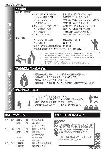 NPO法人制度ができて15年。滋賀県内には600を超えるNPO法人があり、NPOという言葉も社会に定着してきました。しかし、まだまだ活動基盤が脆弱な団体も多く、社会的なサービスが十分に提供できているとは言えません。このような中で、新しい社会課題を解決しようと取り組むNPOへの期待は、今後ますます高まっていきます。そして、この期待に応えるためには、NPOの組織強化が不可欠です。
