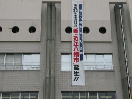 あの垂れ幕が気になったので、再び、10月25日安土町役場に行って見ると、やはり住民の意思を尊重したのか、近江八幡市と安土町の合併に関する垂れ幕は外されて”すっきり”していた。次に相手側の近江八幡市役所を覗いてみると、垂れ幕が堂々とかけてあった。この写真の落差がすべてを物語っていた。