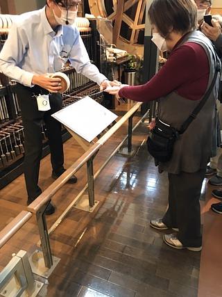 入館後、すぐ近くの円形織機前で集合写真です。