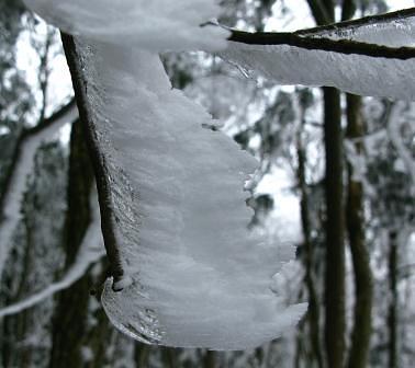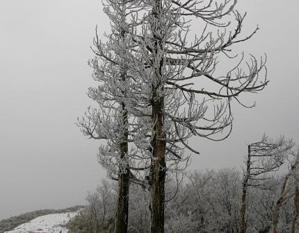 7合目から山頂にかけてガラリと景色が変わった。枝の周りに雪や空気中の水分が氷結し、風の影響でノコギリ状になった「霧氷」が現れ始めた。自然が創り上げたオブジェが次々と現れてきた。 日常眼にしない創造物には驚きと賛嘆の連続であった。ここは、雪・氷の真っ白な別世界だ。