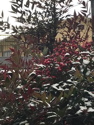 事務所の裏手の公園の南天かな?(千両か万両かも)の木にいい感じに雪が積もっていました