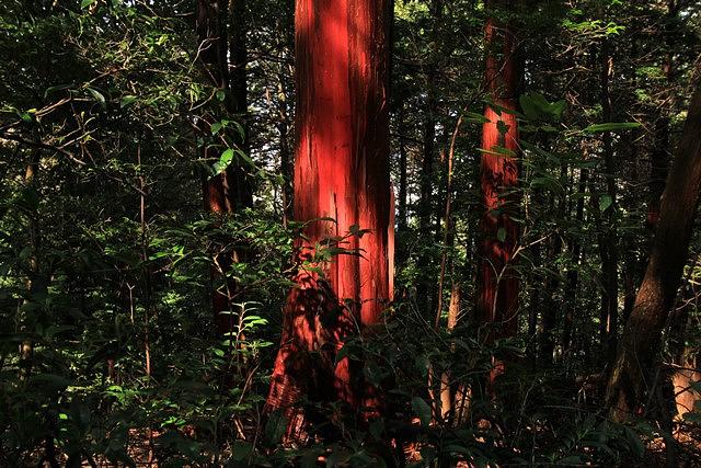 少し広場になった妙見堂跡を通過して、緊急連絡ポイントM-3の表参道を入らず、中段の道を少しいったところを山手に入っていくと、友人が語っていた樹に出会った。羊歯も生えた薄暗いところに、自然色と思えないほど鮮やかな赤色をしたヒノキが何本もあった。根元から手の届く範囲で、皮が剥がされ、その皮が散乱していた。