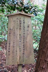 「この檜の大木は神社の屋根修理用の檜皮を試験的採取した大切な神木です。触ったり、傷をつけないようにして下さい」との立札がしてあった。木肌が元に戻るには10年ぐらいかかると言われている。