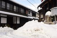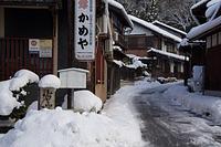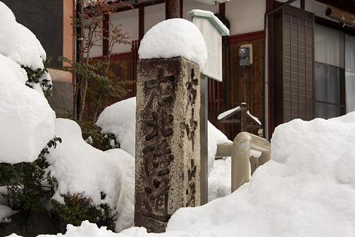 凍てついた雪解け道の三叉路に、この道標があり、後ろには鄙びた「商人宿」の看板を掲げた2階建ての家を、通り過ぎていく数人の学生が写されていた。これから本格的に始まろうとしている北国街道は、寒くて厳しいだろうとモノクロの写真が訴えていた。