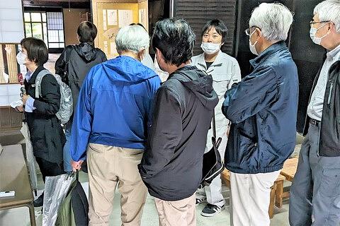 この後、雨の中の鳥居本宿となりましたが、3台の車に分乗Lineのグループ通話を活用して、桧皮葺で擬宝珠のある常夜燈、道中合羽の店、脇本陣、本陣の住居部を昭和に建替え、ヴォ―リス建築となった建物等を案内、赤玉真教丸の有川薬局へ。薬局の建物は1751年に建てられ国の重要文化財で、明治天皇が木曽路に向かわれる時に休憩されたお隣りも見せていただきました。 今回有川製薬の方にシッカリ説明頂きました。