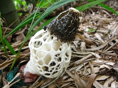 上の暗緑色の部分が粘液状で悪臭を漂わせ、この匂いに蠅などの昆虫が集っていました。美しい網目のスカートは数時間後には萎れて崩れてしまいました。