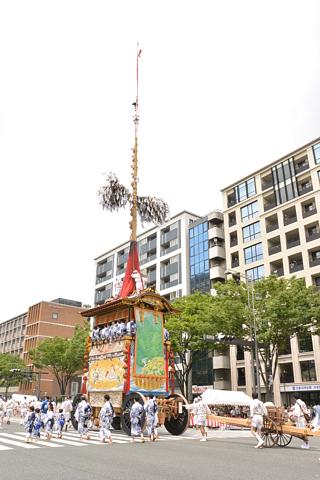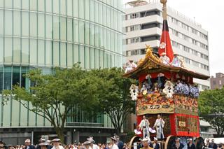 11:00をまわる頃、やっと一番の長刀鉾が来ました。そのあとの山を数基見てたら人混みの中にいるせいか、だんだん息苦しくなって来たので、人混みのなから脱出しました。