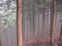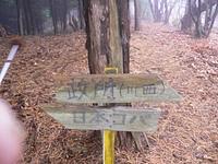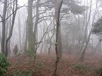 ガスに覆われ下界の展望は利かなかったが、代わりに、幻想的な森林・湿地帯を進むことになった。政所コース分岐点から、道標に従った。左に進み山腹に沿って少し下り、小さな沢を登ると、稜線の鞍部に出た。