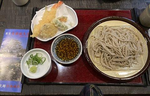 昼食は城外に出て、つる亀庵でした。 伊吹在来種の新そばを使った天ぷらそばで美味しくいただきました。