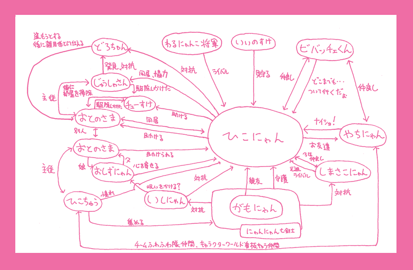 おさんぽひこにゃん(Nintendo Switch)でわるにゃんこ将軍が衣装チェンジでどろちゃんそっくりの服に着替えられます。借りたものなのか、似ているだけなのか関連が分からないため相関図には線を引いていません。
