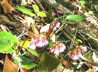 駐車場から指示標にしたがってカズラ谷に向かった。直ぐに小さい流れを渡渉しながらゆっくりと登山を開始した。右手にカズラ滝を見ながら、よく踏み込まれたV字に掘れた溝道を登っていった。一汗かいた頃、落葉が敷き詰められた樹林で、淡いピンク色のイワカガミの群落が出迎えてくれた。