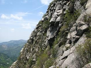 水沢岳で一息入れて「馬の背渡り」のザレ尾根にやってきた。ここには今にも崩れそうな細尾根が下に延びており、その先が見えない。特に、右側の足元の切れ込みが鋭くどこまで落下してしまうか不安がよぎる。滑りやすいのでヨチヨチ歩きになり、手でバランスをとりながら、一人ずつ慎重に渡りきった。