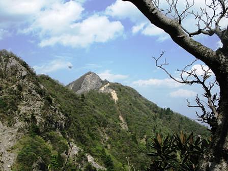 出始から急登の岩頭を登りきると、小さなキレットに出くわした。岩壁に鎖が取り付けてある「カニの横ばい」のクサリ場を横切っていった。滑落すれば命がないが、慎重に行動すればそれほど危険も感じなかった。花崗岩が風化した滑りやすいザレ地の幾つものピークを越えていった。衝立岩と呼ばれる岩山も鎖に助けられて無事通過。後を振り向くと鎌ヶ岳の鋭鋒が鋭く天空に突き刺すようにその存在を見せつけていた。