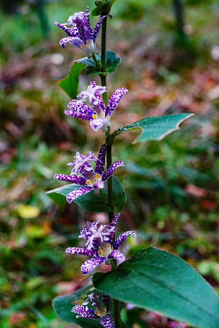 そこは、山道の端には崖が迫り、水がにじみ出ていました。木漏れ日も差し射し込み、この花にとっては安住の居場所なのでしょう。当初2本程度育っていましたが、現在6~7本に増えました。そして、今年になり、その花を愛でに訪れる人々が増えてきました。そして皆さん口々に「ヤマジノホトトギス」と語り始めました。私は、園芸種でなかった場合、それは日本固有の「ホトトギス」だと思っていました。その名前には、どうしても馴染めない感覚があり、じっくりと観察し、調査を重ねてみました。