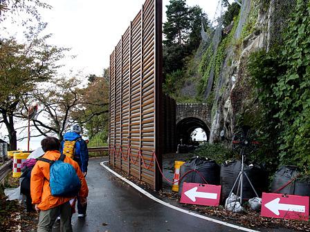 現在、終日片側交互通行となっているが、当時土日祝日のみ道路の閉鎖が解かれたとの情報を得たので、半信半疑、土曜日に出掛けたものである。兎に角、崩落個所を頑丈な遮蔽板で囲われていた箇所を急いで通過した。初めてのトンネルを越えると、海津大崎(大崎観音)・義津浜 まで30分ほどで行けた。