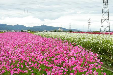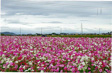 ある日、近江八幡市から八日市に向かって野田町付近を自動車で走っていると、 田園風景の中に突如カラフルなコスモス畑が眼に入った。これが、初めての出会いだった。