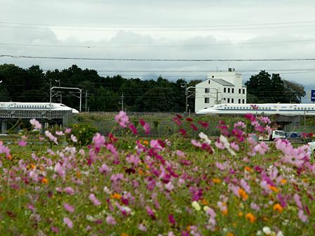 私の自慢は、コスモスを前景に上り下りの新幹線車両が、交差する直前の瞬間画像を捕らえることができたことだ。