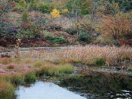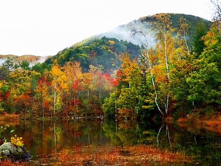 一の瀬園地の中程にあるレストラン「座望庵」の隣にある公園駐車場からすぐのところにある「まいめの池」は、乗鞍高原を代表する撮影ポイント。ここは標高約1,450mにあり、紅葉の時期は早く、例年10月上旬に紅葉が始まり、既にピークを迎えていた。