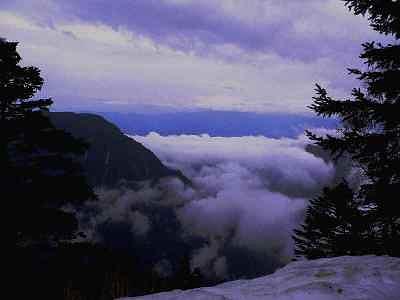左前方に燕岳から大天井岳へ連なる白い主稜線の一部が見えてきたが、雲に覆われ、有明山(標高2268m)は、ますます黒々となり不気味になってきた。この日は、日本海中部と九州の南には前線を伴った低気圧があり、天候が悪化するとの予報であった。