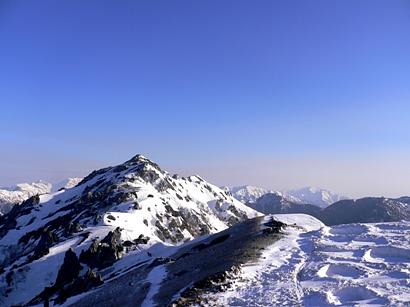 合戦小屋は、屋根まですっかり雪に埋もれ、入口のみ雪掻きをして営業をしていた。温かいコーヒで一息ついて早々に出発した。合戦の頭(標高2489m)から森林限界となり、完全に雪の世界に突入した。