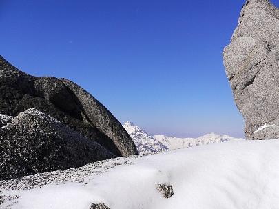 燕岳は、花崗岩と花崗岩砂礫の大きな岩が印象的な山である。頂稜部ではそれらが奇異な形の岩塔があった。雪に埋まって形がはっきりしないが、イルカ岩と思われる奇岩の間から槍ガ岳を撮影した。