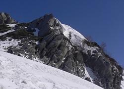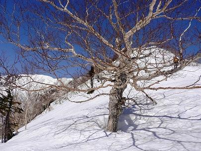 登りの時、全く気づかなかったダケカンバ(岳樺)が、合戦の頭の付近に点在していた。 白い雪面の中で少し赤茶色かかったダケカンバの幹は青空に映えて、より一層美しかった。風雪に耐えダケカンバは、一株から何本も茎を出し、妖気さえ漂わせていた。雪崩地や荒れ地、寒冷地など他の樹木が生育しづらい環境にあえて育つのであろう。植物のたくましさを感じた。