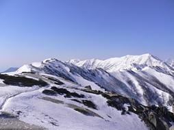 あれほど荒れた天気が一転して絶好の日和になった。 朝早く出発した。雪道は、昨夜粉雪が降り、全面クラストのためアイゼンを装着した。アイゼンの爪と氷が触れる摩擦音「サア、サア」と言う心地良い音を立てながら登っていった。山頂までの道は、ほとんど西側斜面のトラバースルートがつけられていた。紺碧の空に続く白い雪道は、燕岳に延びている。素晴らしい稜線散歩になった。