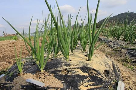 隣の玉ねぎの畑では、春先になると石灰を撒いて殺菌など色々工夫されています。私もこの方法を真似ていました。最近、園芸の仲間が、「玉ねぎに米ヌカが効くので、撒いている」と聞いたので、試しています。米を精米した際に発生した生の米ヌカを無料でもらっています。ぱらぱらと地面や葉に撒きます。作物に余り付着しないので、1~2週間毎に行なっています。