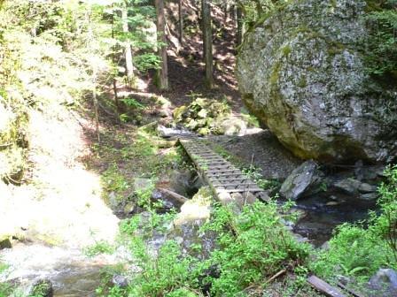 そうこうしていると、我がチームも揃い出発準備も整い、大勢が、新緑の林道を辿っていった。林道は、峰床山・八丁平を源流とし安曇川に流れ込む支流沿いにつけられている。数日前の雨のため豊富な水が流れ、瀬音を聞きながらさわやかな出発となった。30分ほどで大岩がある林道終点に着き、ここで丸木橋を渡って伊賀谷に入った。